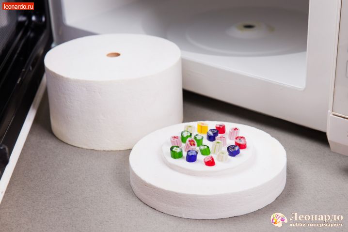6. Положим заготовку нашего кулона с разложенными сверху миллефиори на термобумагу. Накроем крышкой и поставим в микроволновку еще на 6 минут.