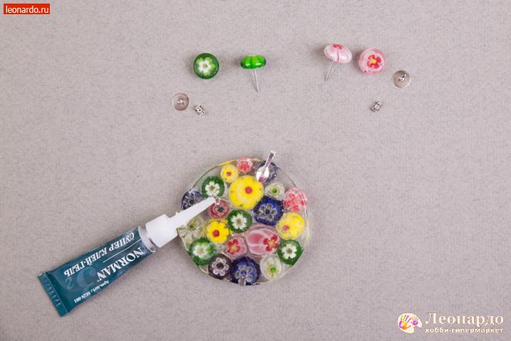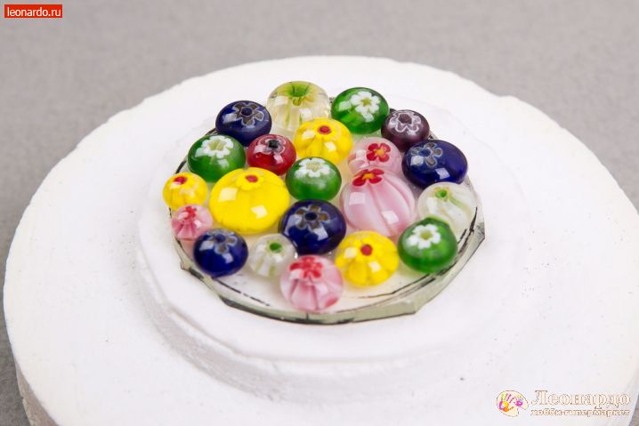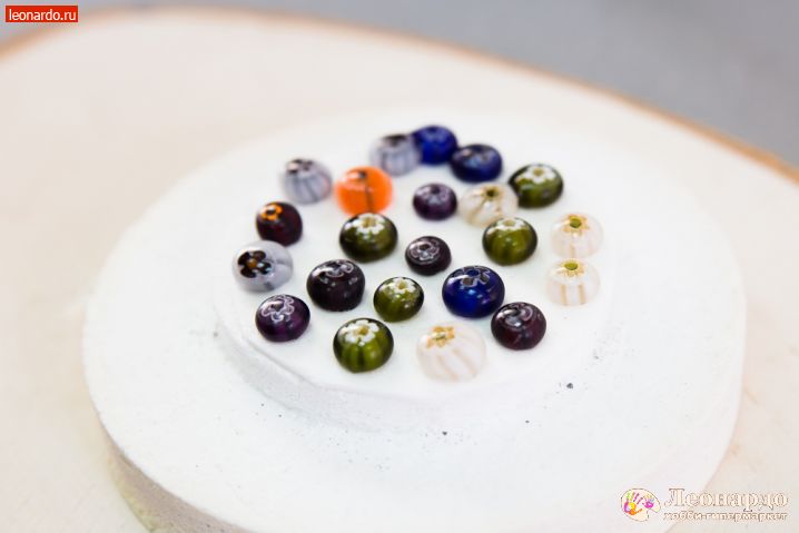 5. На полученную заготовку разложим в произвольном порядке запеченные элементы мозаики. По две миллефиори одного цвета и размера отложим для изготовления сережек-гвоздиков.