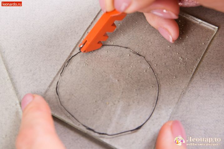 4. На поверхности прозрачного стекла с помощью стеклореза вычерчиваем круг. С помощью плоскогубцев лишнее стекло по краям круга отламываем.