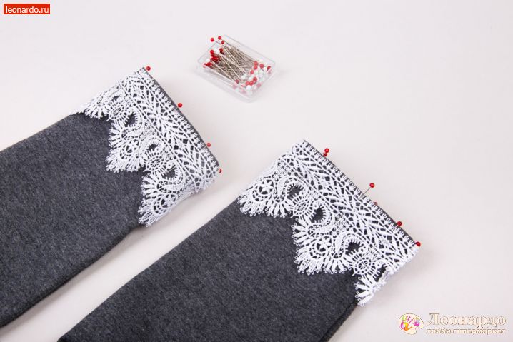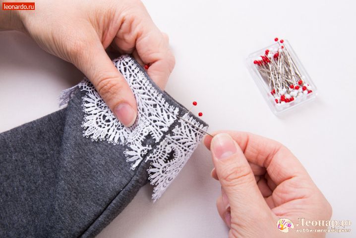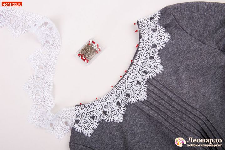 2. Подготовленный гипюр прикладываем к горловине платья и скалываем иглами для закалывания со стеклянными головками GAMMA (арт. PH-010).