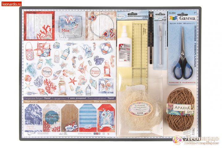10. Для оформления рамок вырежем из листа скрап-бумаги Mr. Painter (арт. PSR 190505 "Море") декоративные элементы: флажки, ракушки, черепаху, фонарики и другие.