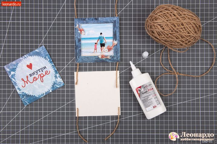 9. Сверху наклеим рамку и, как следует, прижмем её к фотографии, подождем, когда клей высохнет. Нижние края шнурка наклеим на оставшуюся свободную заготовку из пивного картона так, чтобы между рамкой с фото и заготовкой остался промежуток 2 см. Снизу на заготовку также приклеим кусочки джутового шнура. Затем приклеим сверху карточку с надписью. По такому же принципу приклеим оставшуюся заготовку с фотографией.