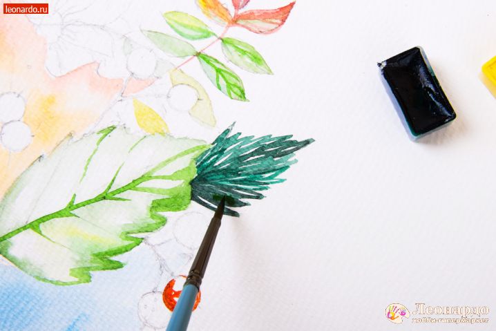 4. Рисовать зеленую растительность можно как уже готовыми цветами, так и получая новые оттенки путем смешивания желтого и синего.