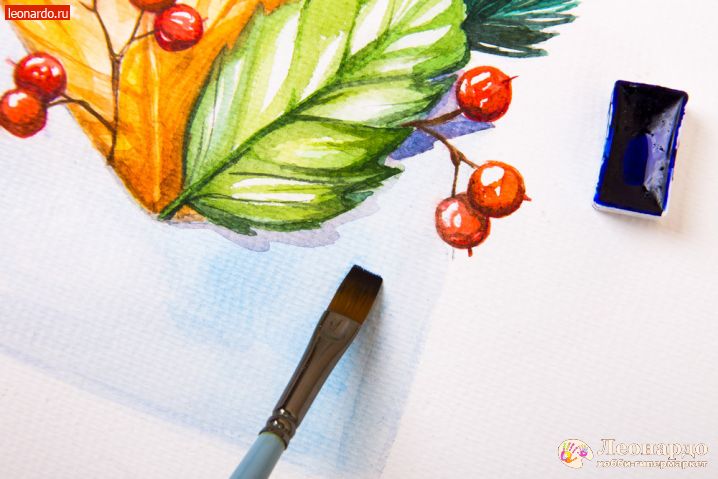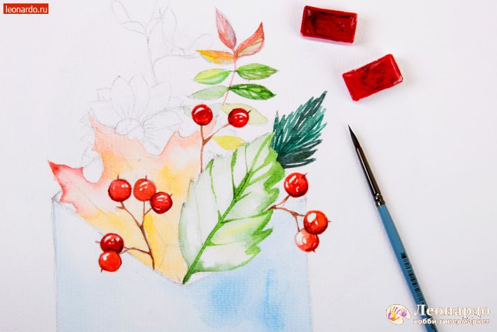 12. От ягод и листа, которые перекрывает конверт, падают тени. Их можно сделать более темным синим или голубым, чтобы появился объем. Но не следует делать их очень темными, чтоб не было ощущения дыр.