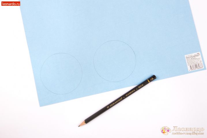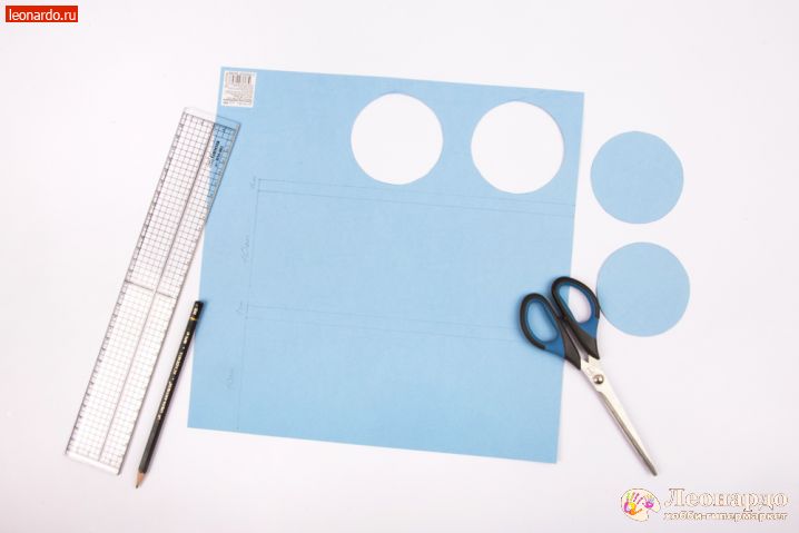 Но сначала необходимо создать основу из плотной бумаги. Возьмем кардсток Mr.Painter (арт. PST 30.5 x 30.5 см (30 Нептун, (голубой)) и нарисуем два круга диаметром 7-8 см, используя циркуль или любой предмет подходящего диаметра. Бумага PST - это крашеная в массе бумага, то есть на сгибах и разрезах бумага имеет тот же цвет, что и на поверхности. Это позволяет использовать ее как основу для создания коробочек, основы скрап-страниц или открыток.