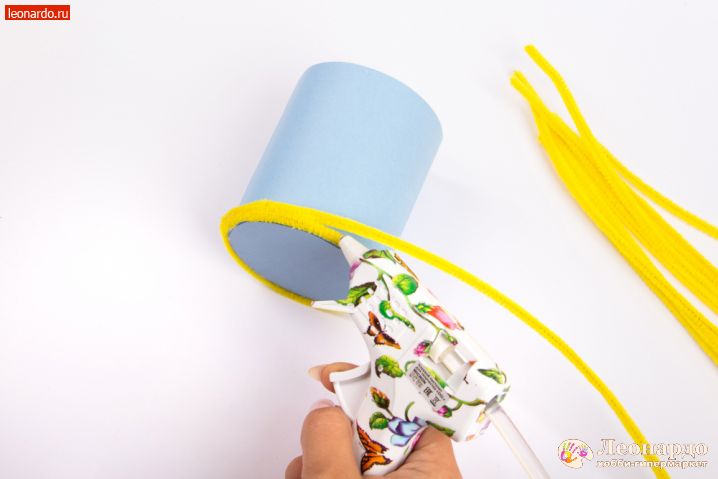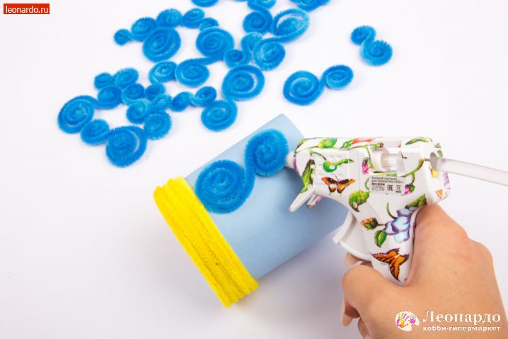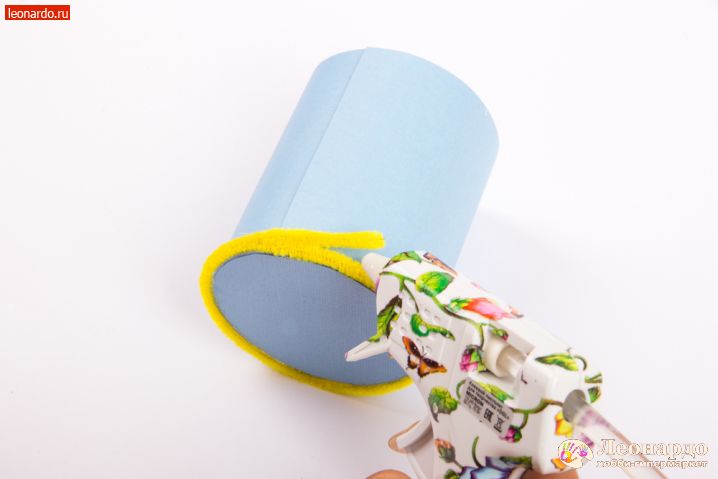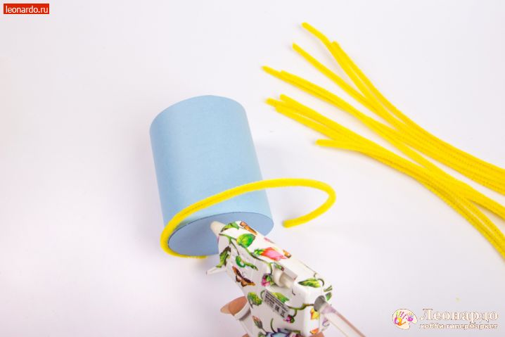 7. Начинаем обклеивать картонную основу шенилом Hobbius (арт. KPW-6 0.6 x 30 см 30 шт, ассорти). Используем клеевой пистолет Micron (арт. DGL 01). Если изделие делает ребёнок, проследите, чтобы работа с нагретым клеевым пистолетом обязательно велась под присмотром взрослых! Для первого этапа возьмём жёлтую проволоку. Клей наносим поэтапно, контролируя, как ложится шенил на основу.