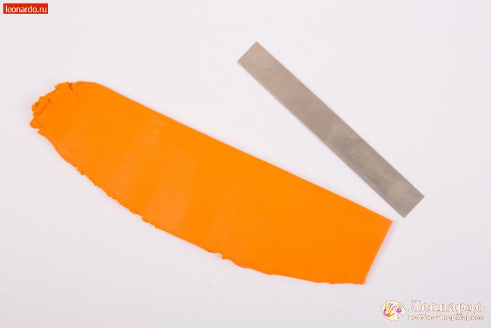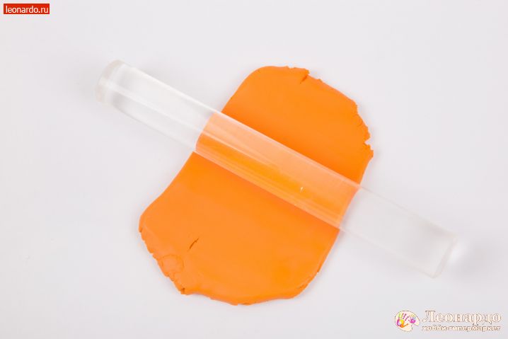 3. Вручную разминаем две пачки полимерной глины оранжевого цвета Craft&Clay (арт. CCH) до мягкого состояния. Изделия из полимерной глины Craft&Clay превосходно держат форму, не боятся воды и солнца - не выгорают. На фоне классической глины детали из флуоресцентной пластики выделяются яркими неоновыми цветами и светятся в ультрафиолете. Раскатываем их в плоский пласт с помощью акриловой скалки Craft&Clay (арт. CCQ-04).