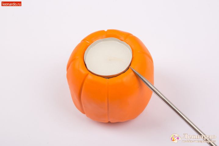 14. Закрепляем листочки и усик на тыкве и запекаем работу. Свечку предварительно вынимаем, чтобы она не расплавилась. Запекаем в течение 25-30 минут при температуре 120 градусов.