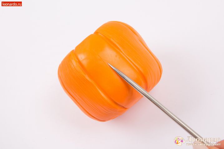 7. Стеком наносим глубокие вертикальные полоски – делим тыкву на дольки. Острой стороной стека наносим на каждую дольку узор из тонких полосок.
