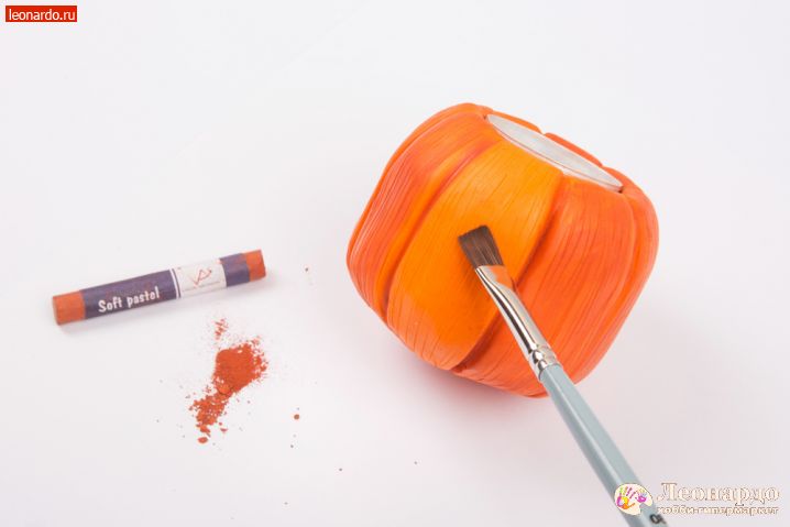 8. Сухую пастель терракотового цвета из набора VISTA-ARTISTA (арт. VASP-12) крошим в мелкий порошок. Кисточкой наносим пастель на всю поверхность тыквы, тщательно втирая в нанесенные ранее полосочки.