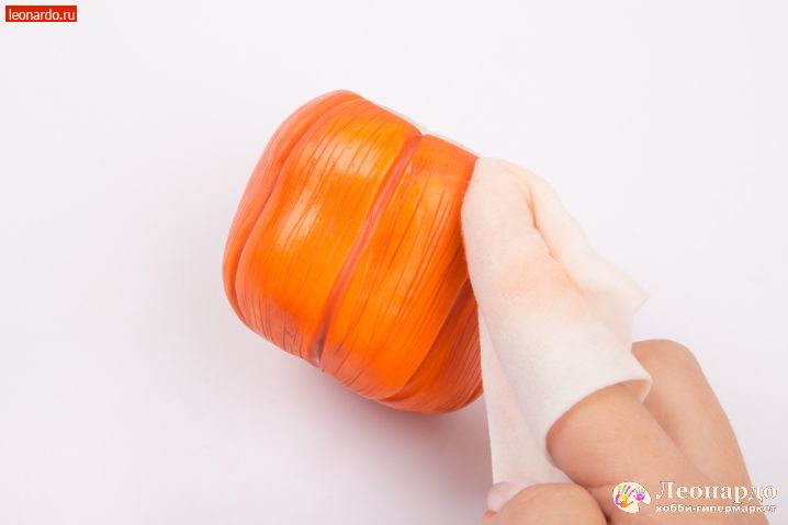 9. Влажной салфеткой удаляем лишнюю пастель с тыквы. Затем тонируем с помощью кистиVISTA-ARTISTA (арт. 70112-06), подчеркивая рельефную поверхность тыквы. СОВЕТ: для более качественного удаления лишней тонировки также можно использовать жидкость для снятия лака.