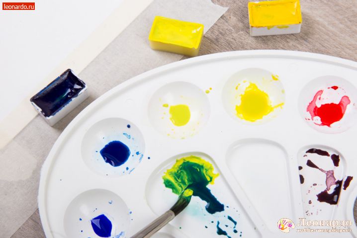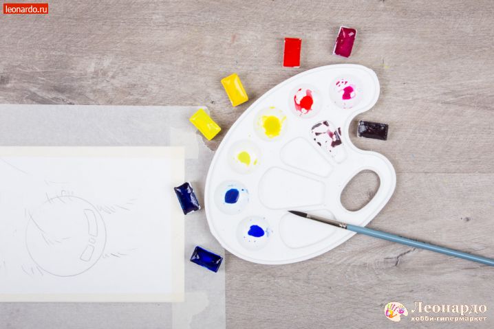 3. Подготовим палитру. Краски смачиваем водой. Небольшое количество каждого цвета добавим в ячейки палитры, чтобы их легче было смешивать.