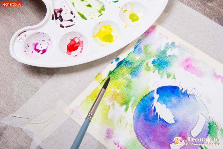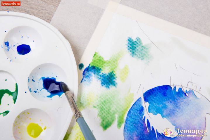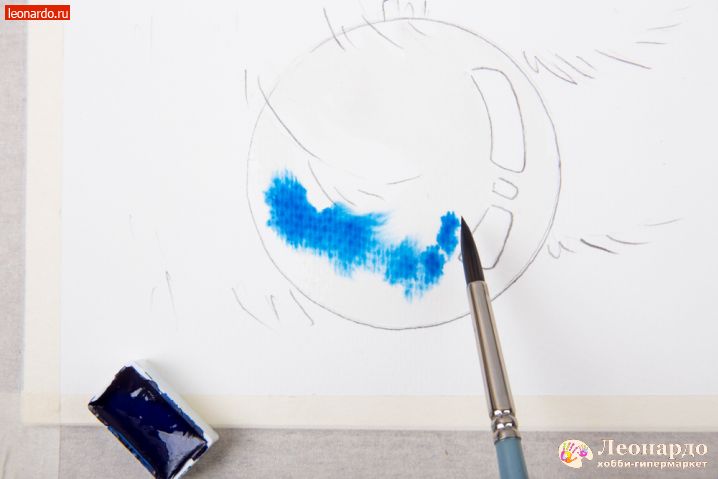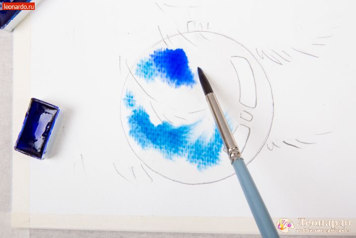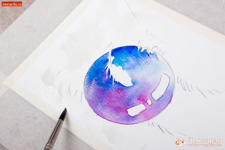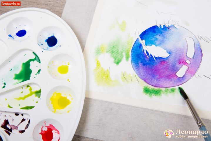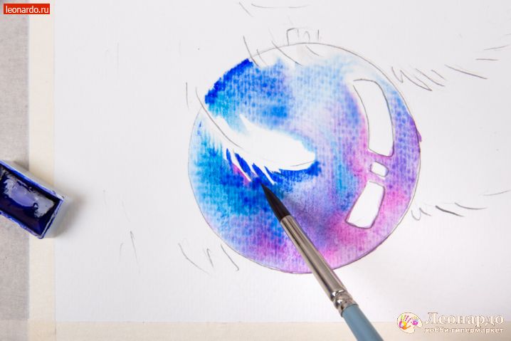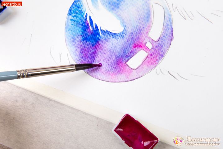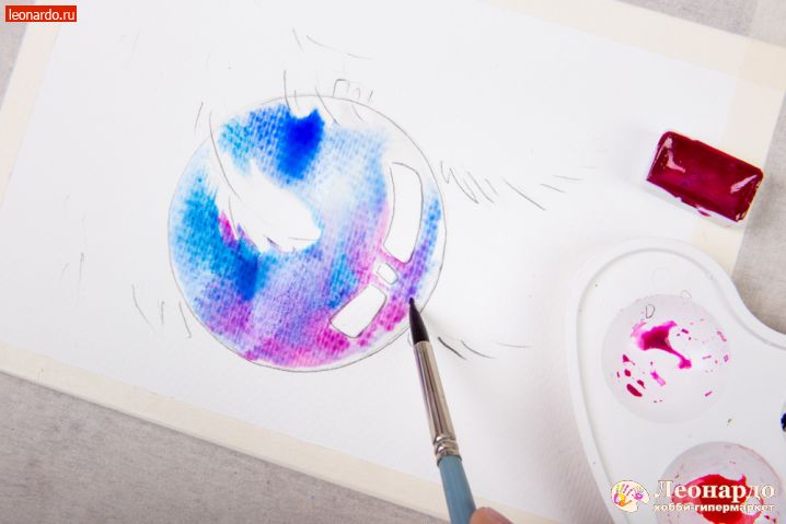 5. Пока бумага остается влажной, начинаем добавлять цвет. Кистью наберём немного краски из палитры и легкими касаниями нанесем на смоченный участок. Для шарика возьмем голубой, синий, и розовый цвета.