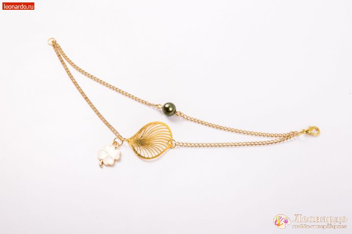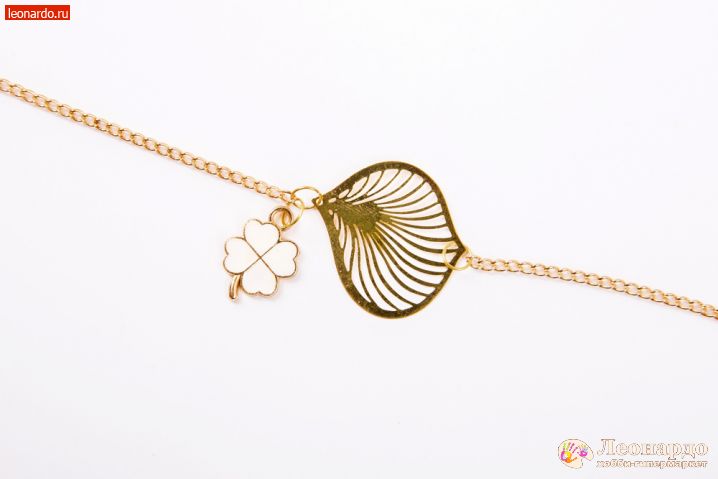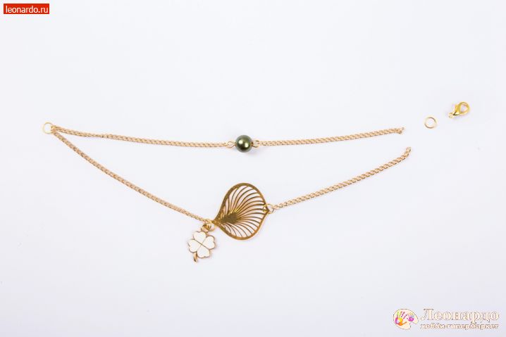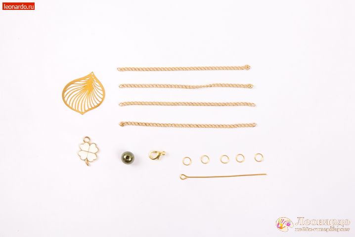 1. Для браслета нам понадобится 4 отреза цепочки размером 8 см, филигрань Лист - 1 шт, подвеска Клевер - 1 шт, бусина - 1 шт, карабин - 1 шт., кольца - 5 шт, штифт - 1 шт.