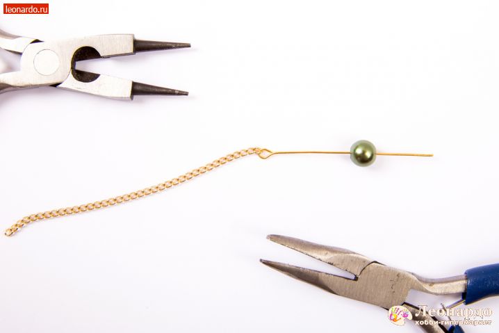 5. С помощью круглогубцев Micron (арт. HTP-27) укорачиваем штифт, оставляя 1 см от бусины. В штифт вдеваем цепочку (последний отрез) и круглогубцами скручиваем в петлю.