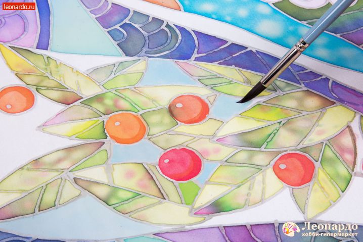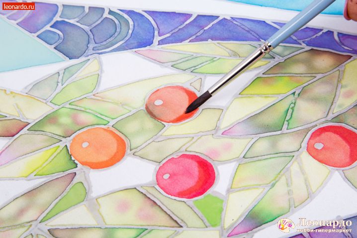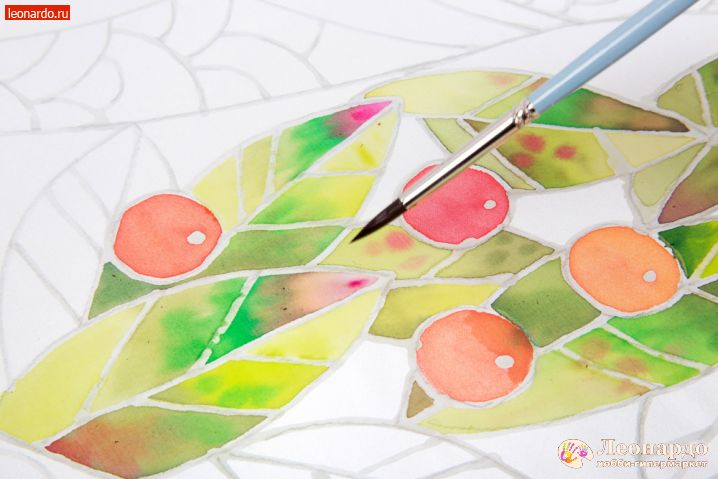 14. Заполняем пространство между листиками и ягодками лазурным - №24 цветом, разбавив его водой.
