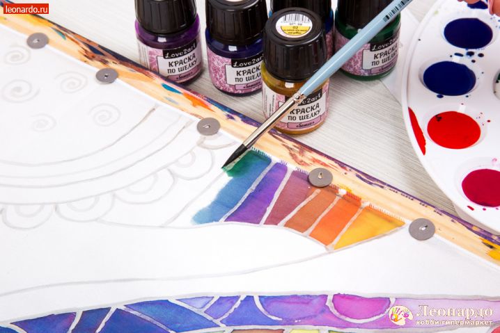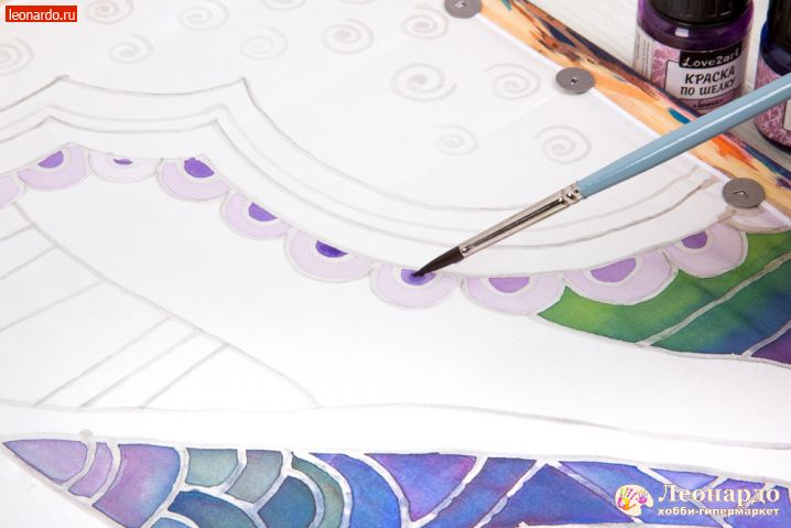 11. Для создания плавного перехода на большой площади, смачиваем шелк водой. Если этого не сделать - будут видны границы от переходов краски.