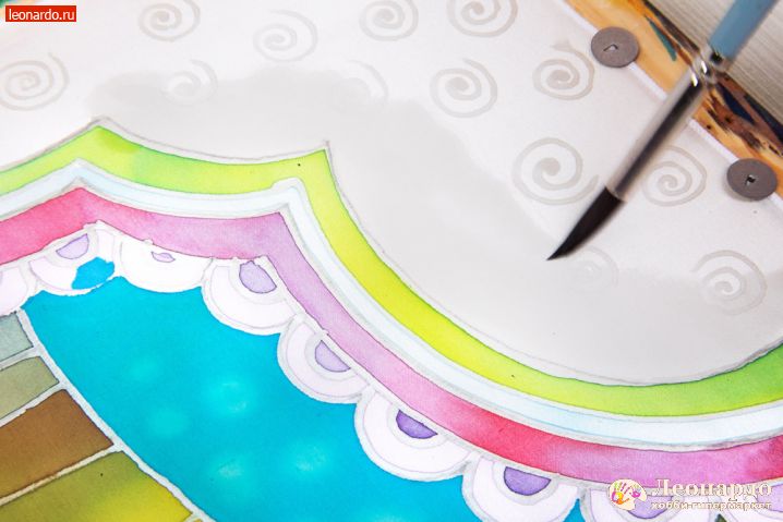 10. Бирюзово-лазурный цвет получаем с помощью двух красок: в лазурный - №24 добавляем капельку краски зеленая трава - №12. Когда краска начинает подсыхать, добавляем поверх капельки кисточкой смоченной водой.