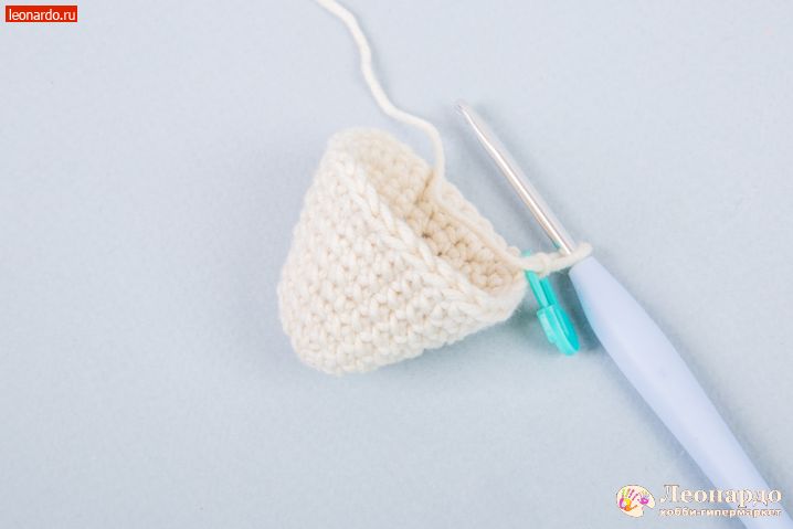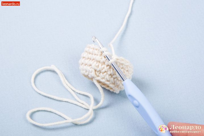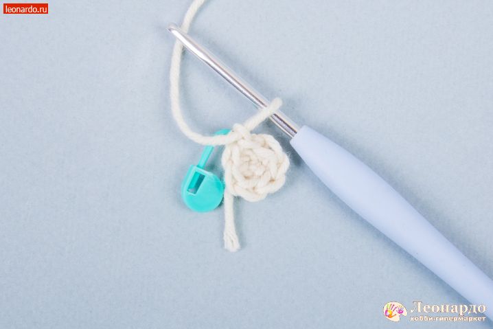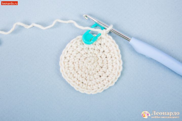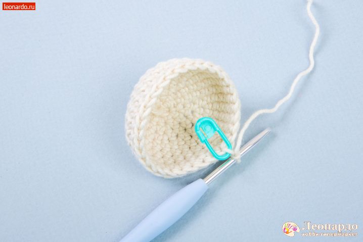 1. Начинаем вязание с головы. Набираем З воздушные петли (далее вп), замыкаем в кольцо. В начале ряда вяжем вп для подъема и надеваем на неё маркер GAMMA (арт. MKL-20). Вяжем столбиками без накида (далее сбн) 1 ряд – 6 сбн, 2 ряд – 12сбн, 3 ряд – 18 сбн, 4 ряд – 24 сбн.