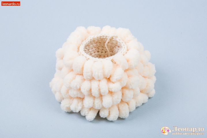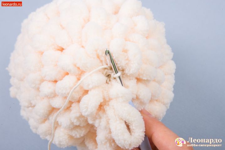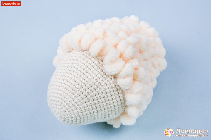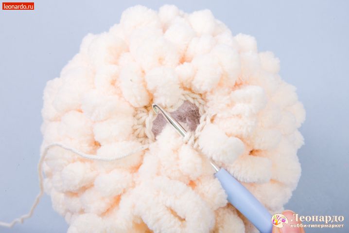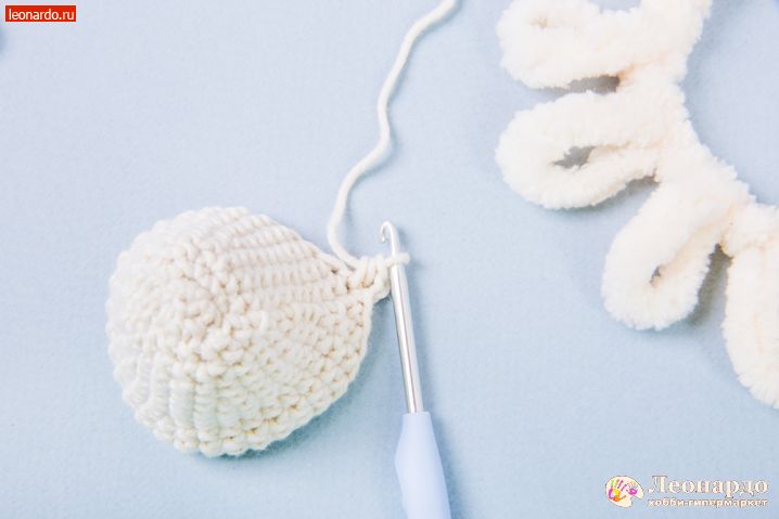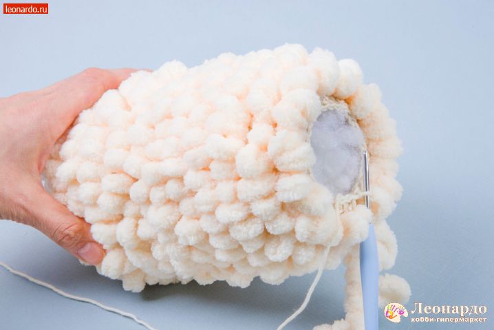 14. Набиваем деталь наполнителем GAMMA. 30 ряд провязываем основной нитью по 2 петли вместе. 31 ряд с петлистой пряжей по 2 петли вместе, петлистую пряжу отрезаем коротко. Основную нить отрезаем 10 см, все петли стягиваем, деталь готова.