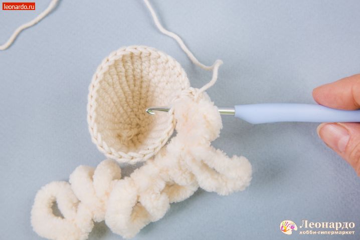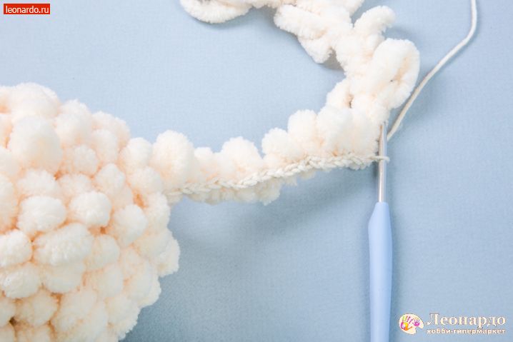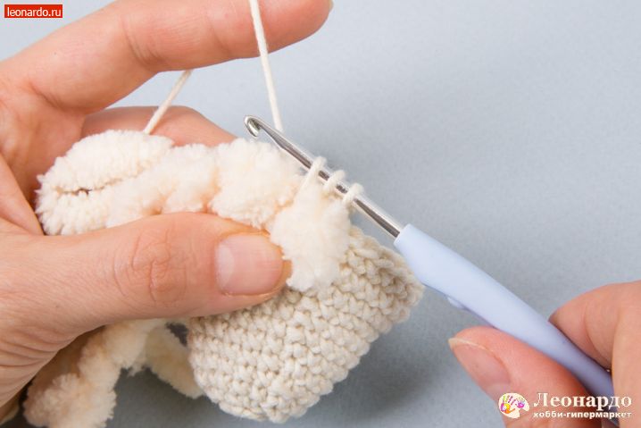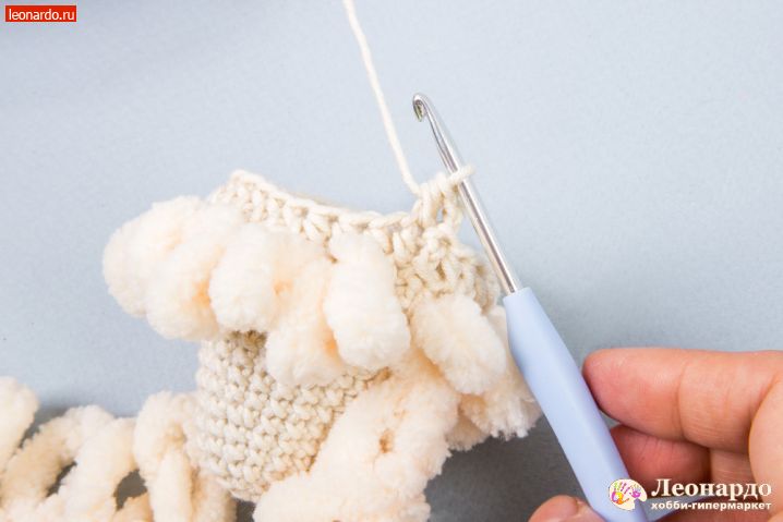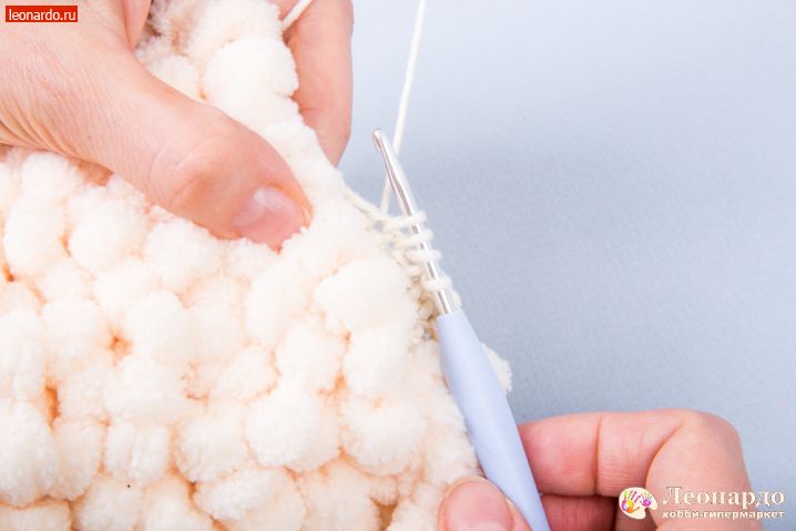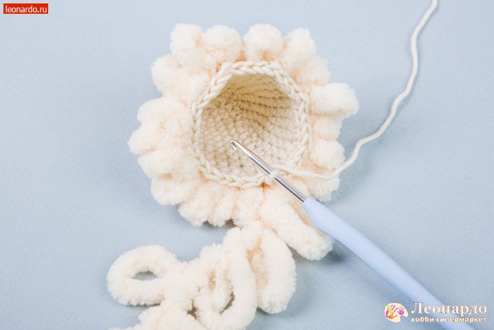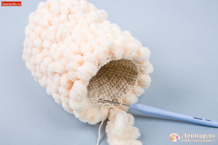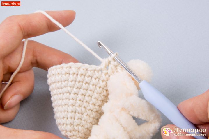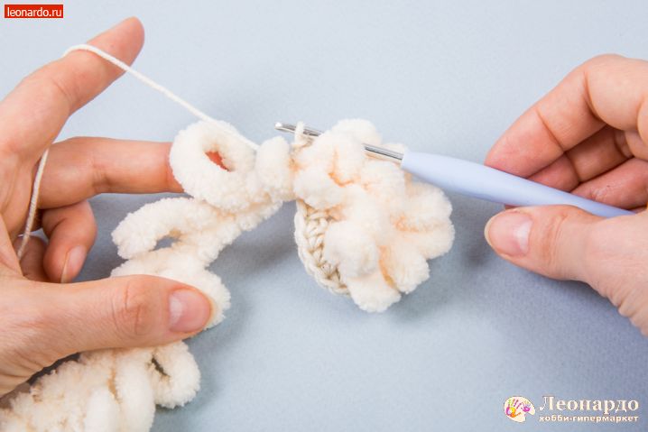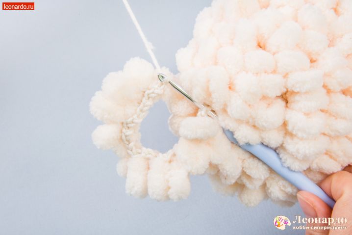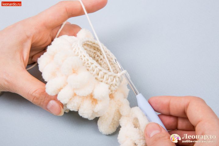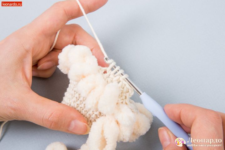 17. Во 2 ряд вводим петлистую пряжу, прихватываем её через каждые 2 псн. Вяжем 12 столбиков.