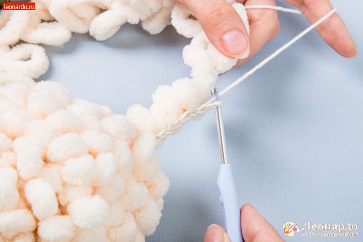 26. Вяжем цепочку вп основной нитью, через каждые 3 петли прихватывая петлистую пряжу.