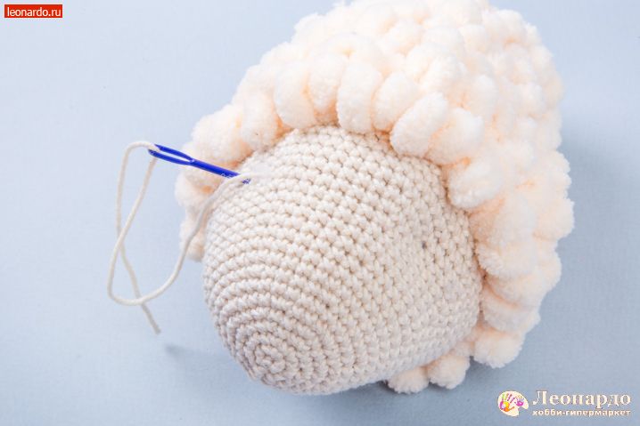 43. На голове отмечаем и стягиваем места для глаз, пройдясь иглой с основной нитью от одного глаза к другому.