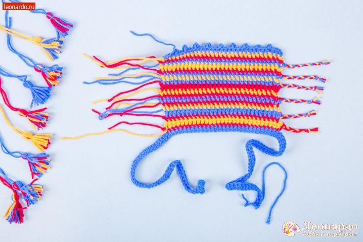55. Делаем 8 разноцветных кистей. Оставшиеся нити на попоне заплетаем в косички.