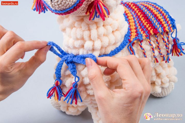 51. Для попоны набираем синей нитью ALPINA "VERA" цепочку вп достаточную, чтобы обернуть ламу и завязать бант на шее. Провязываем ряд сбн. Центральные 30 петель выделяем маркером. Чередуя нити разных цветов, вяжем 19 рядов. Ряды вяжутся сбн, псн и столбиком с 1 накидом в разном порядке. В начале и конце ряда оставляем концы нитей примерно по 12 см. Последний ряд вяжем синей нитью сбн с пико из 2х вп в каждую третью петлю. Оставляем у него более длинные концы, для фиксации попоны на ламе.