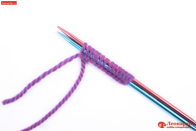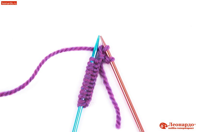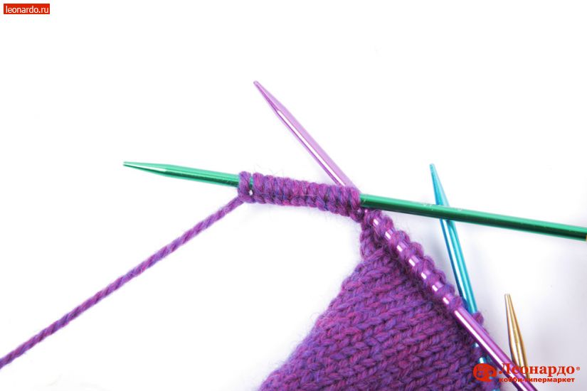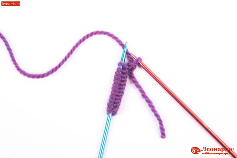 9. Набрасываем вытянутую петлю на третью спицу и продолжаем набирать петли слева направо – в направлении, обратном привычному вязанию.