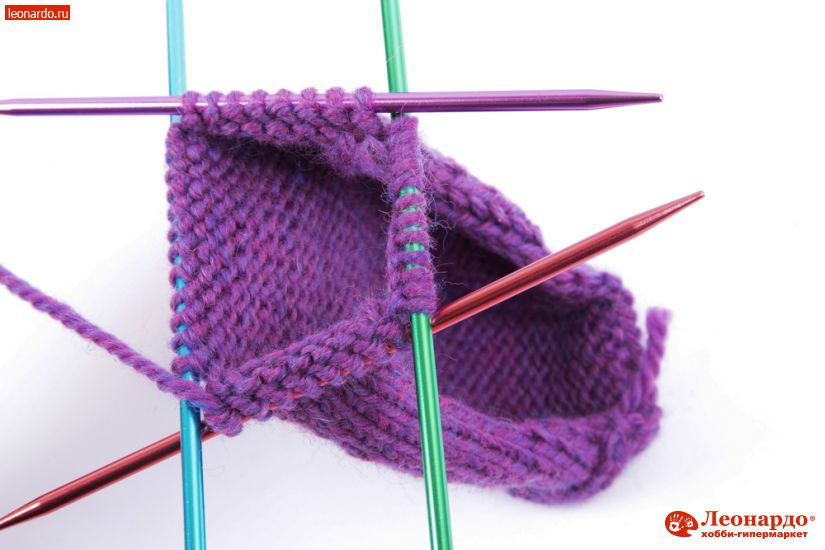 20. Продолжаем вязать по кругу лицевыми петлями. Для удобства дальнейшего убавления петель распределите петли на спицах так, чтобы верхние и нижние спицы сходились строго по бокам, четко разделяя тапочку на верхнюю и нижнюю половину.