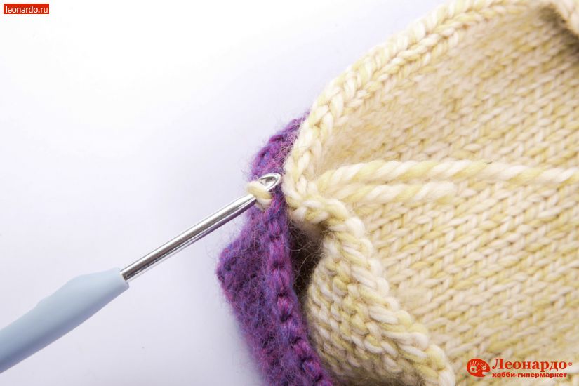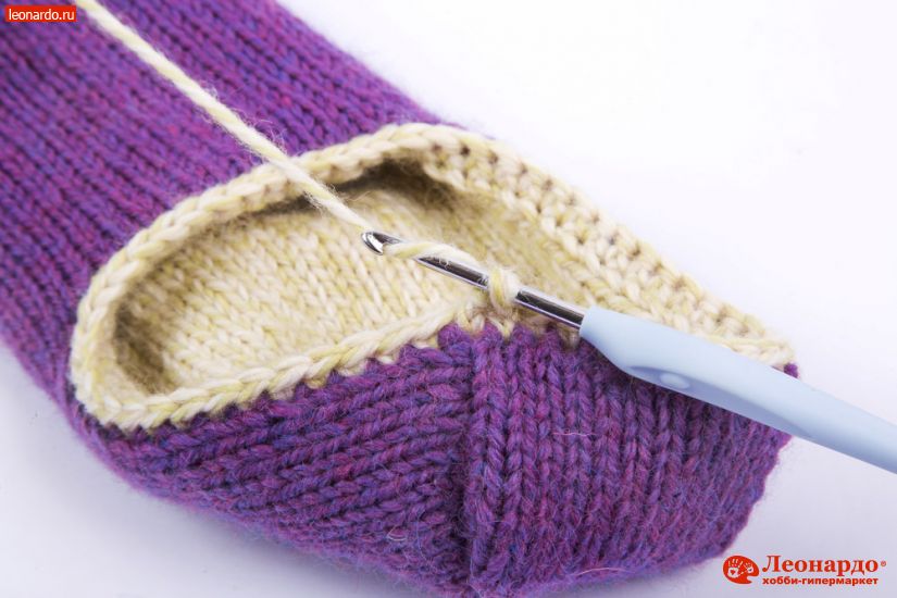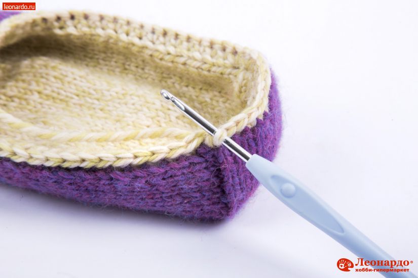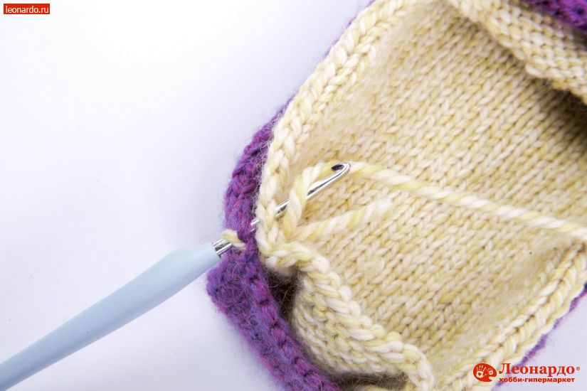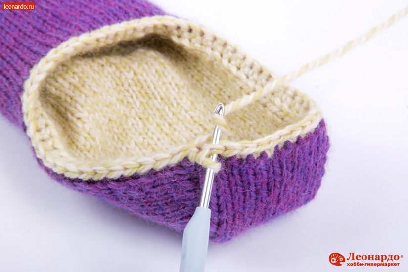29. Таким же образом вяжем внутреннюю часть тапочки из желтой пряжи.