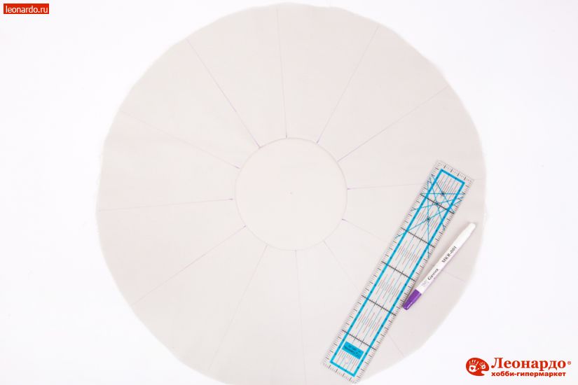 6. Делим круг на 12 равных секторов. Сделать это можно любым удобным способом: например, разметить край окружности с шагом в 13,1 см (такова 1/12 доля длины окружности) и соединить отметки с центром.