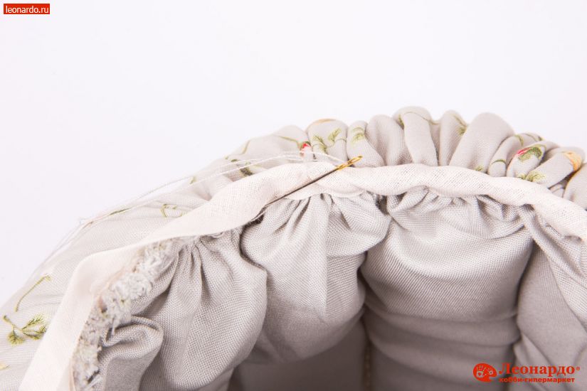 15. Другой край бейки подшиваем потайными стежками, заправляя внутрь сшитый край шкатулки.