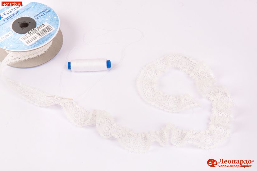 17. По одному краю гипюра GAMMA (арт. GGM-3002) прокладываем строчку белой ниткой, равномерно стягиваем.