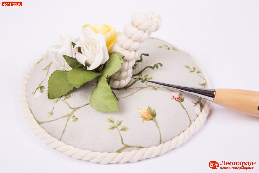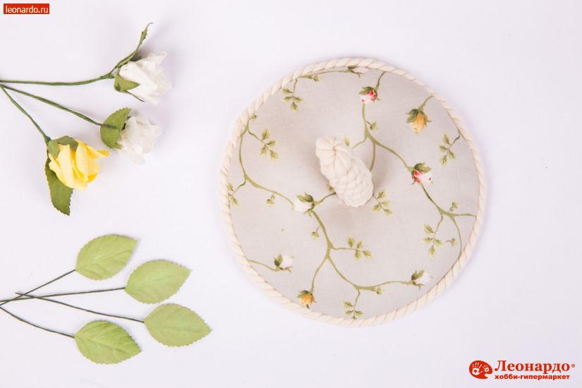 34. Приступаем к декору крышки. Формируем букетик из декоративных листьев Mr. Painter (арт. PFL-02), двух белых и одного желтого цветов Mr. Painter (арт. PFE-12).