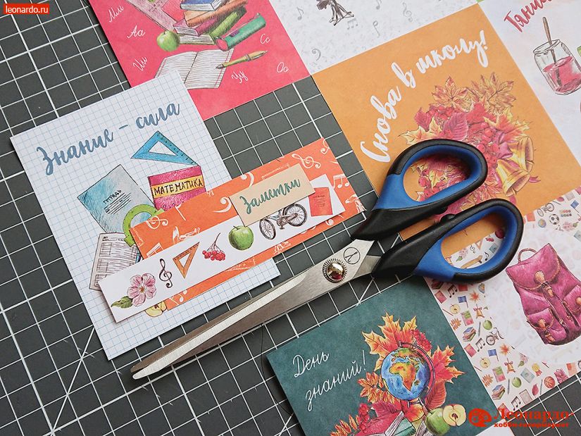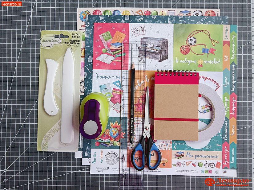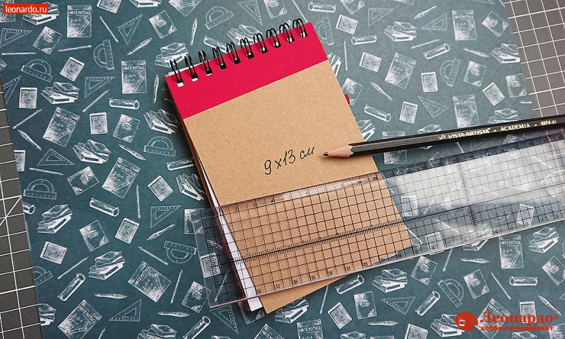 1. Из листа скрап-бумаги Mr. Painter (арт. PSR 190503 «Школьная») вырезаем два прямоугольника размером 9х13 см для оформления обложки блокнота FITEKO (арт. RPB-01).
