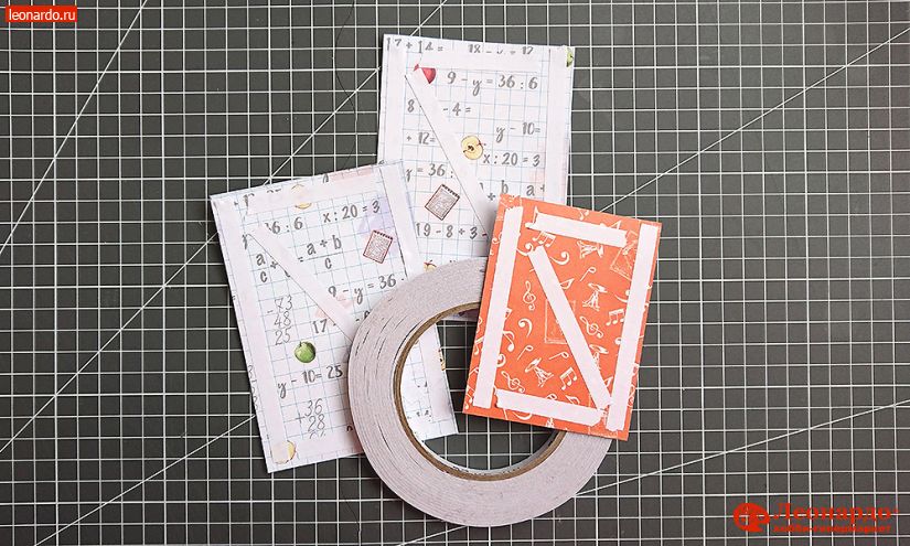 4. Прямоугольники из бумаги и карточка будут приклеены с помощью двустороннего скотча. С обратной стороны приклеиваем по периметру и диагонали несколько полосок.