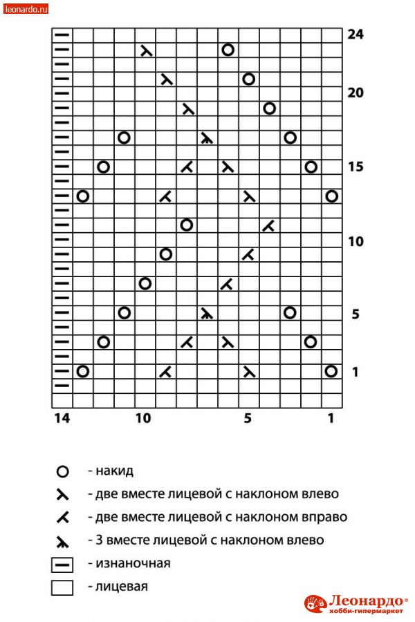 Далее приступаем к вывязыванию основного узора. Рапорт состоит из 14 петель в длину и 24 в высоту.