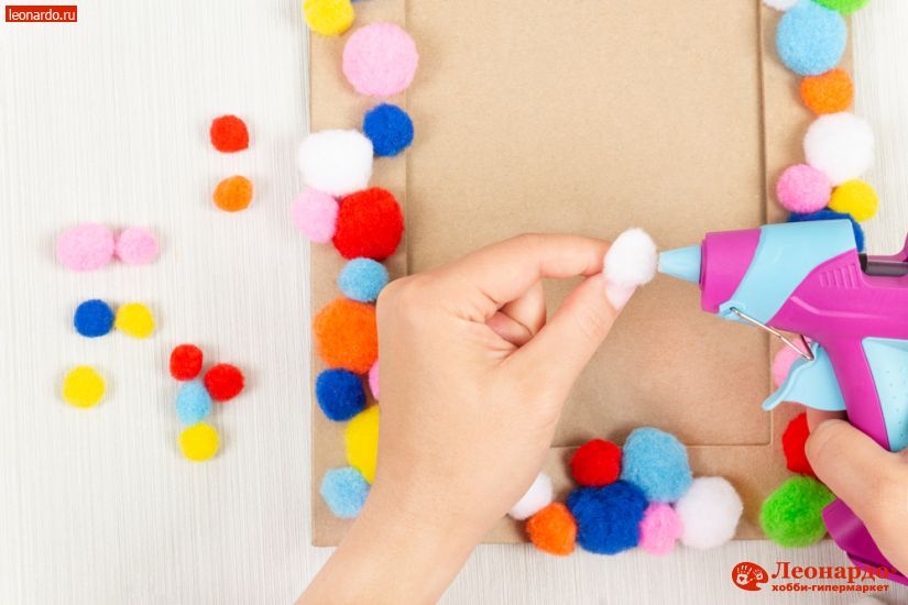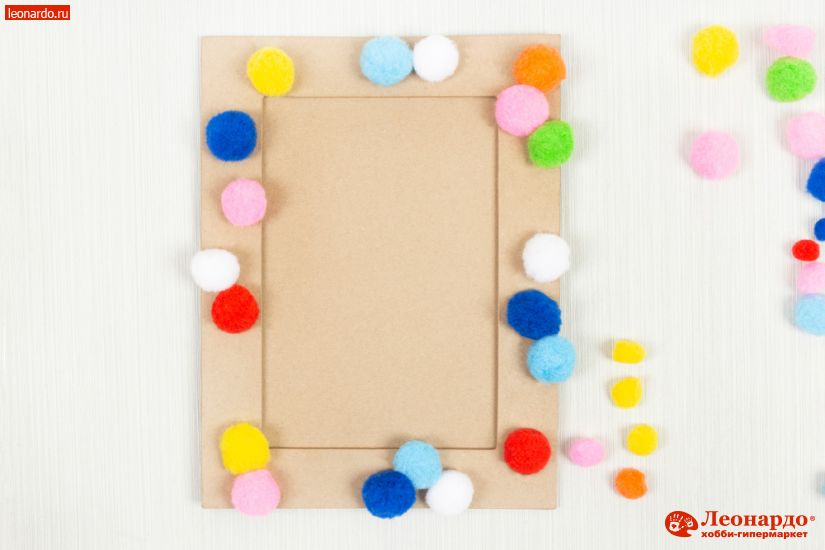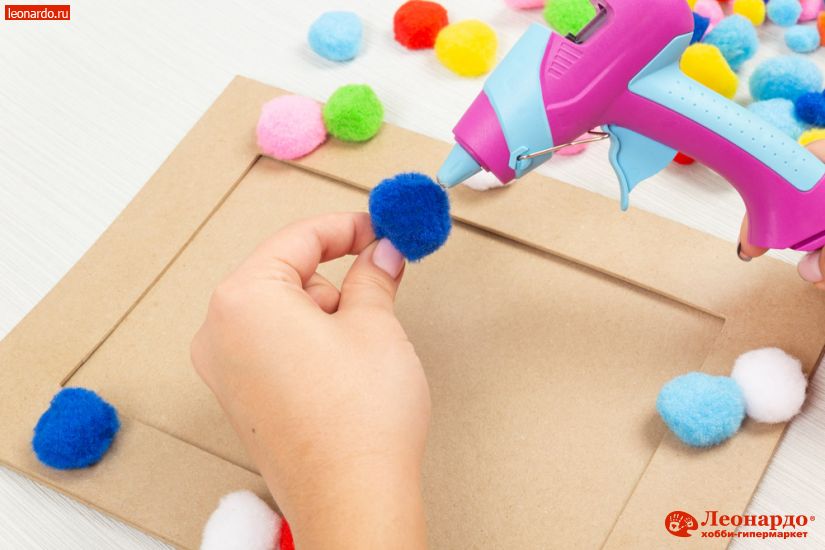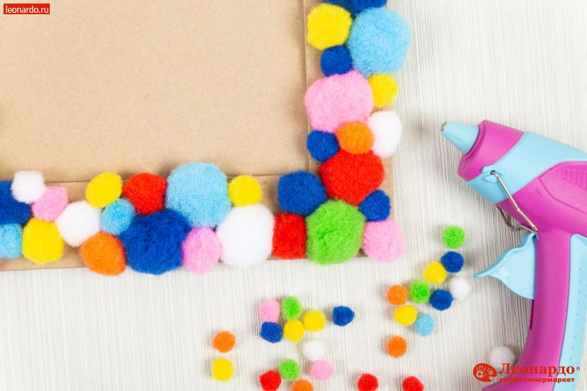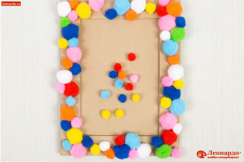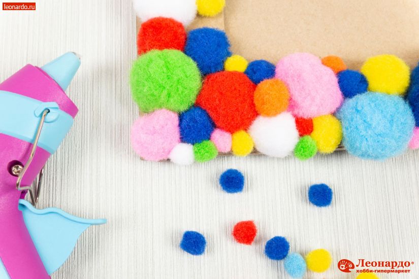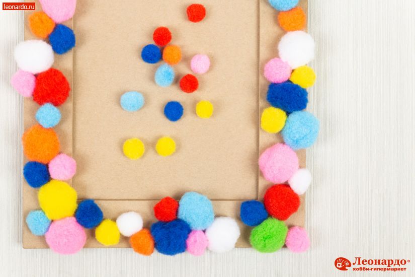 1. Начинаем декор рамки с самых крупных помпонов Hobbius (арт. KPO-30 – 3 см). Располагаем их хаотично по поверхности рамки и закрепляем с помощью клеевого пистолета Micron (арт. MGG-25), можно формировать группы из 2-3 больших помпонов.