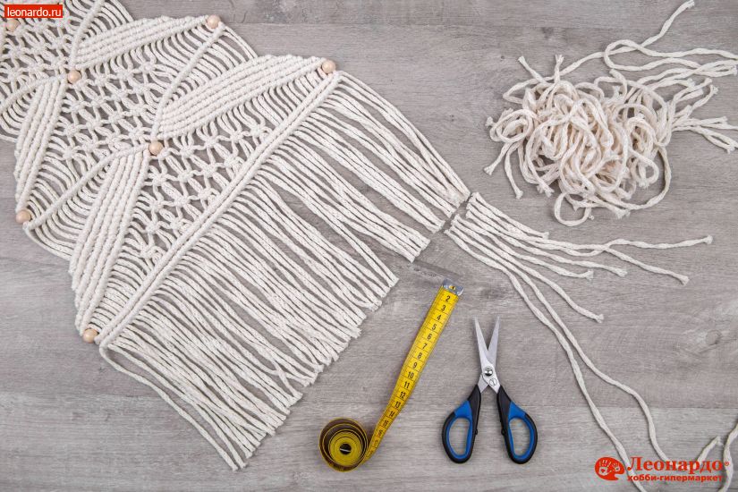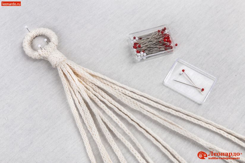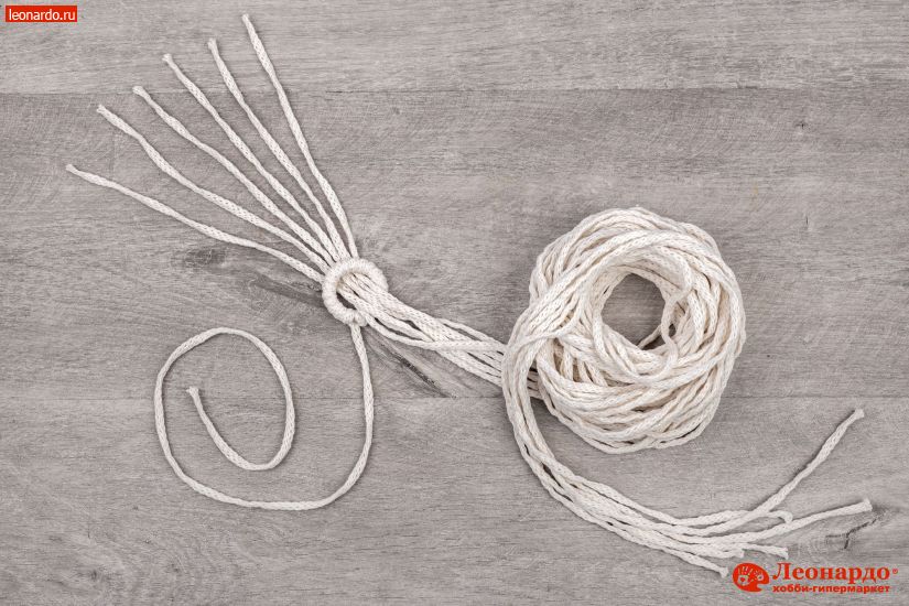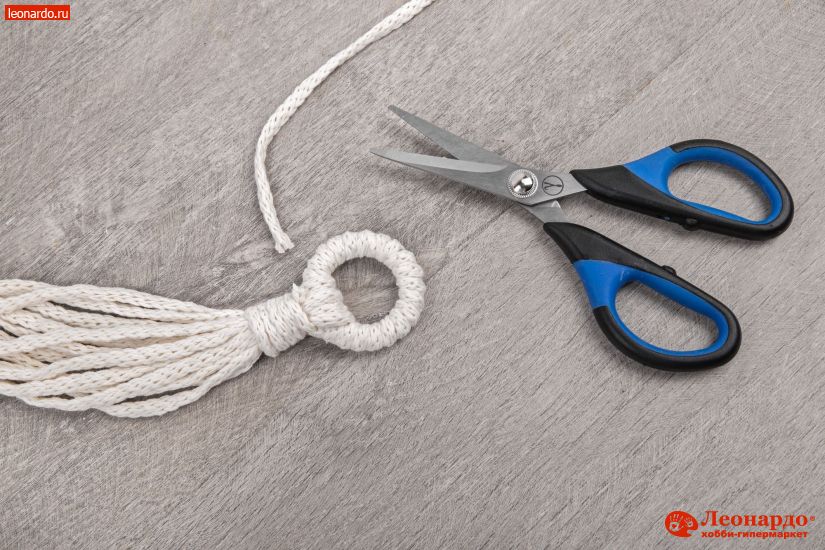 1. При помощи сантиметра GAMMA (арт. SS-112) и ножниц GAMMA (арт. G-203) делаем из пряжи ARACHNA Macrame один шнур длиной 1 м и шесть шнуров длиной 3,5 м.