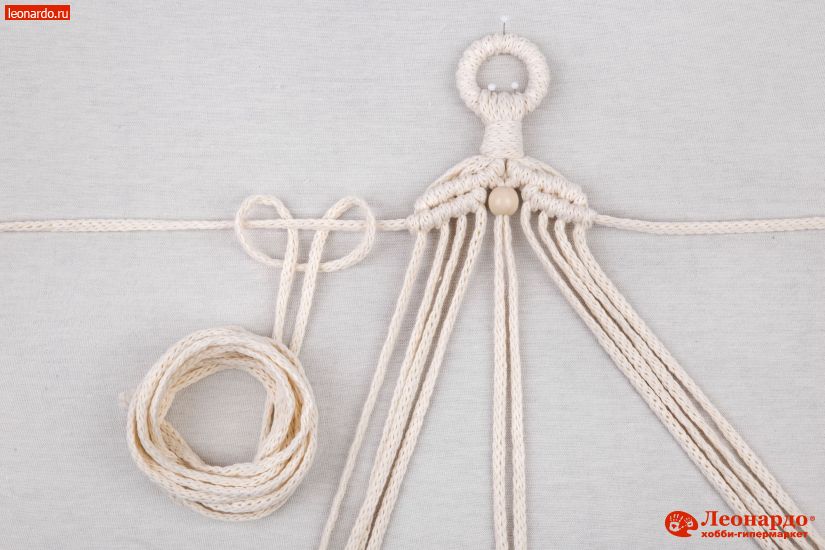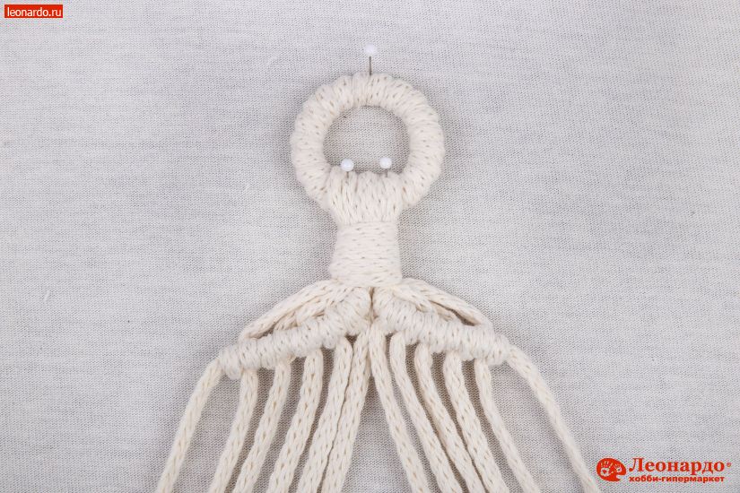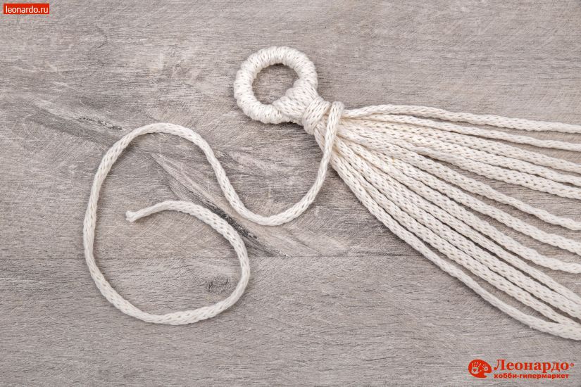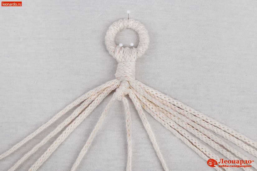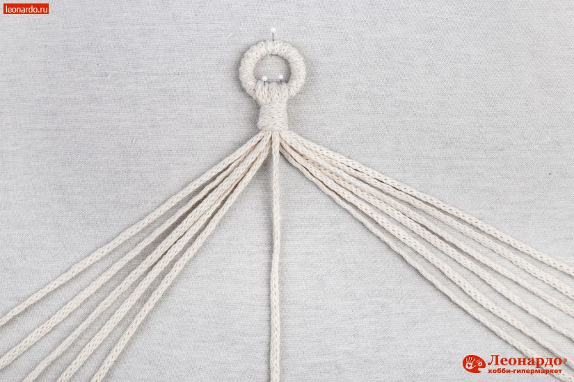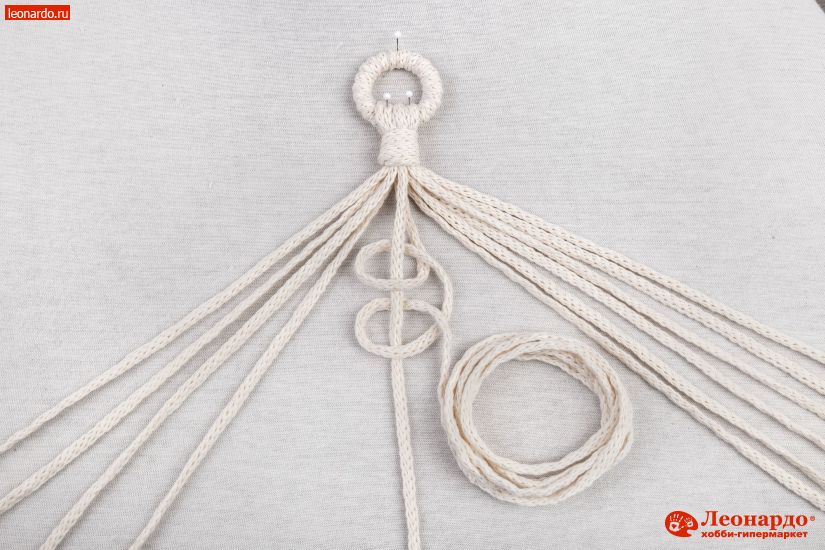 3. Через кольцо продеваем еще шесть шнуров длиной 3,5 м. Протягиваем их ровно до середины и складываем пополам. Должно получиться двенадцать шнуров по 1,75 м в длину.