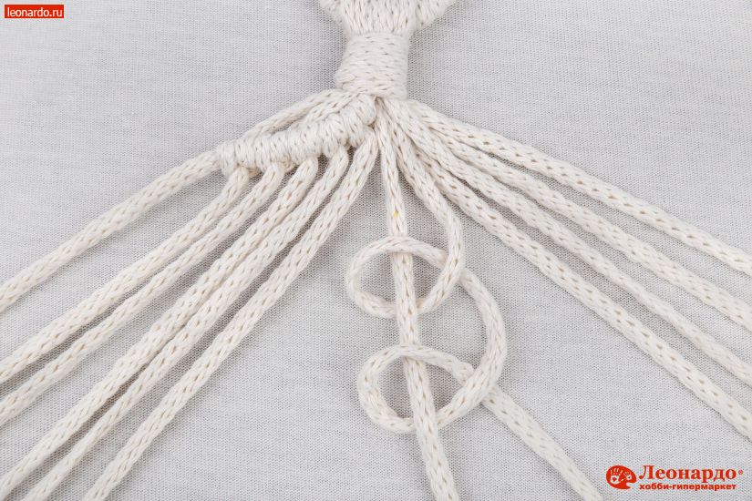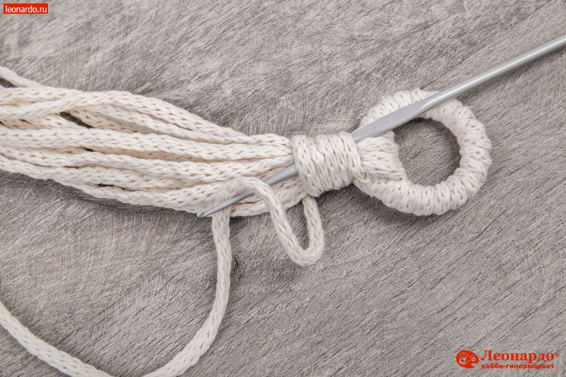 4. Все шнуры фиксируем коротким шнуром в пять-шесть витков. При помощи крючка GAMMA (арт. CHT d 2.0 мм) конец шнура продеваем через витки