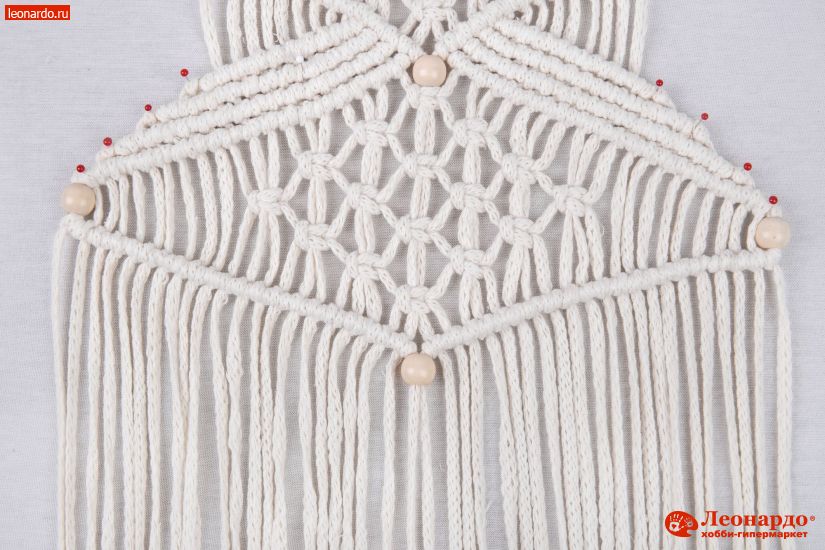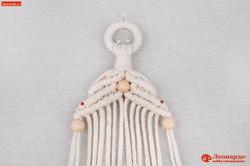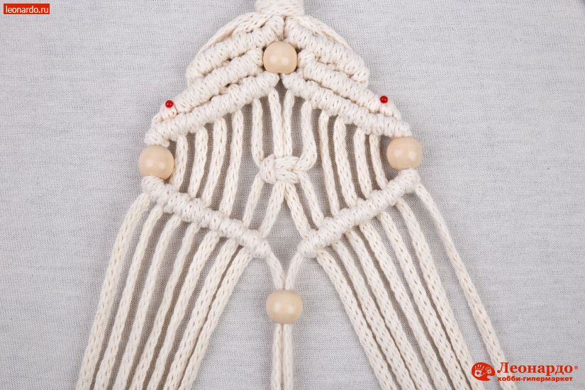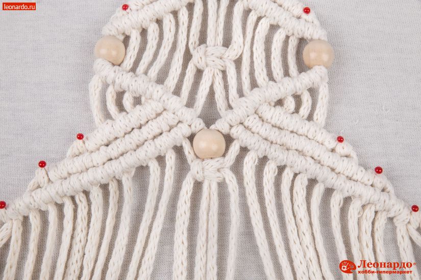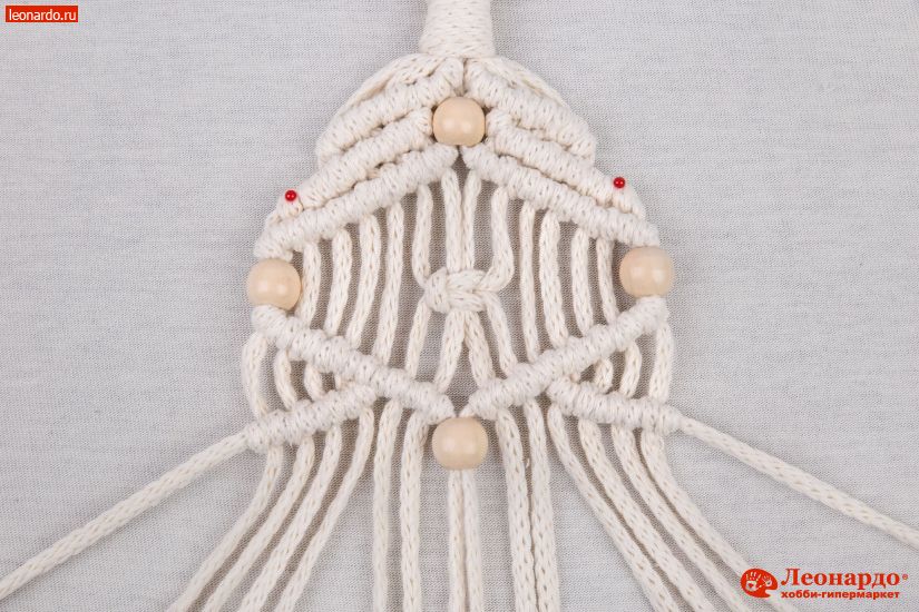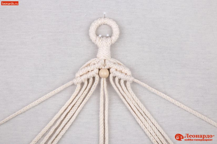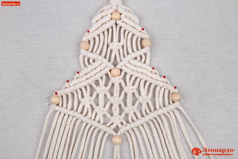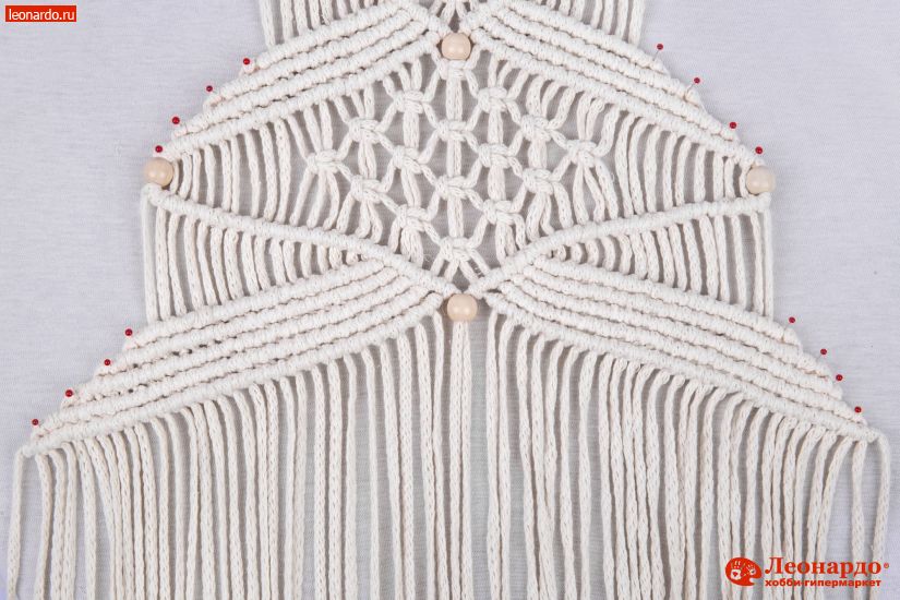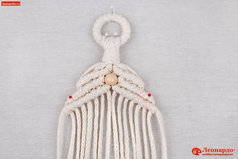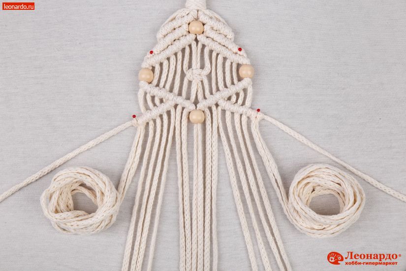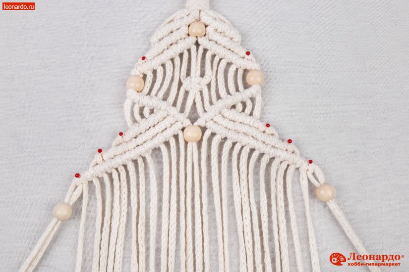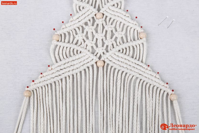 25. Плетём второй и третий ряд репсовых узлов. Из мотка пряжи дополнительно нарезаем шнуры длиной 260 см. Добавляем во второй и третий ряды. Должно получиться 28 нитей. Фиксируем ёлку булавками. Нанизываем бусины в первые две нити и в последние две.