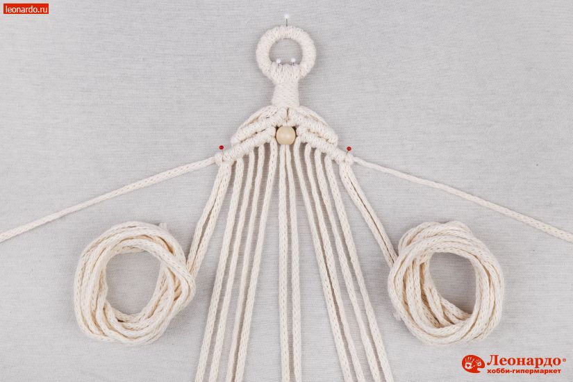 16. Из мотка пряжи дополнительно нарезаем шнур длиной 330 см. Шнур складываем пополам и подводим под основу (пятая нить) петлёй вверх. Опускаем петлю на основу вниз и пропускаем в неё два конца нити, как показано на фотографии.