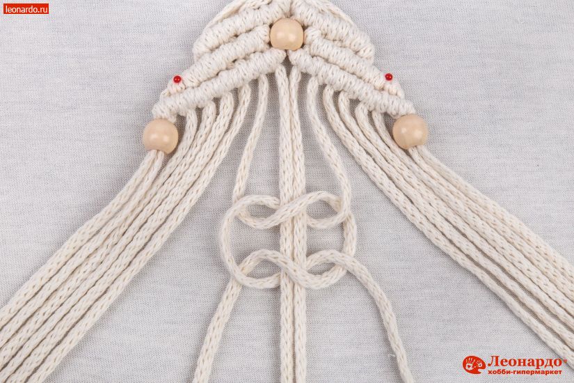 35. Выбираем самый длинный шнур из правой бусины (он будет основой) и провязываем на нём второй горизонтальный ряд репсовых узлов справа налево до левой бусины.