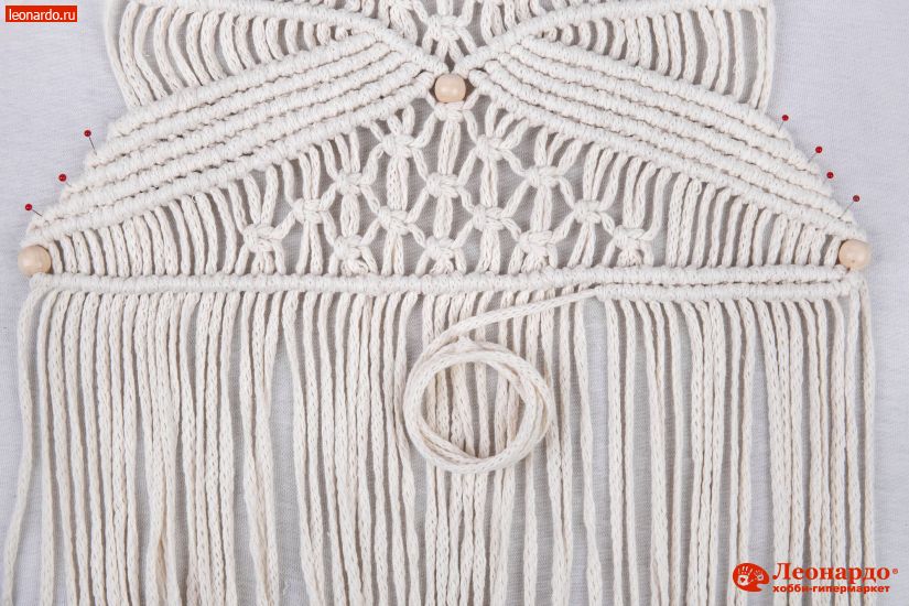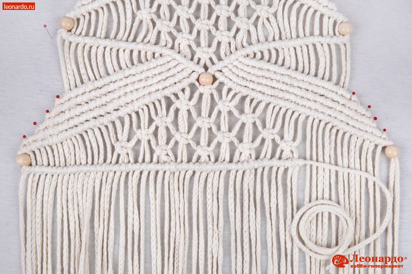 30. Провязываем второй, третий и четвёртый диагональные ряды. Не забываем добавлять шнур в каждый ряд. Шнуры нарезаем длиной 200 см. Фиксируем булавками. Всего нитей должно получиться 44 штуки. Нанизываем бусины в первые две нити и в последние две.