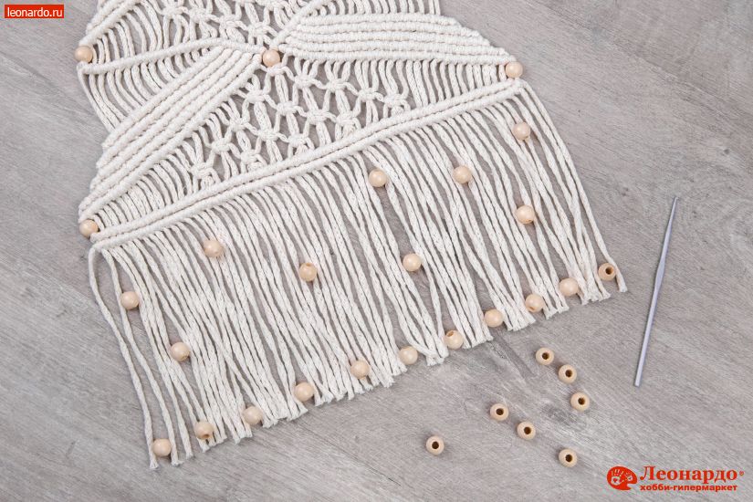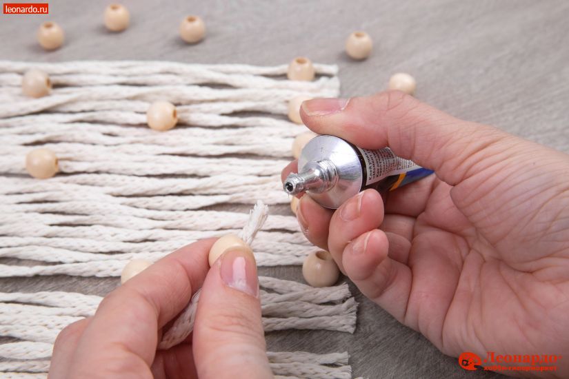 37. Намечаем расположение бусин. При помощи крючка продеваем каждую нить в бусину и фиксируем клеем.
