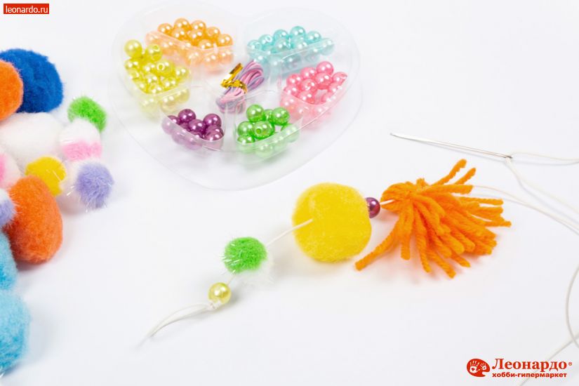 8. Чтобы гирлянда получилась яркой и веселой, чередуем разные цвета и размеры помпонов, миксуем их с разноцветными бусинками и кисточками.