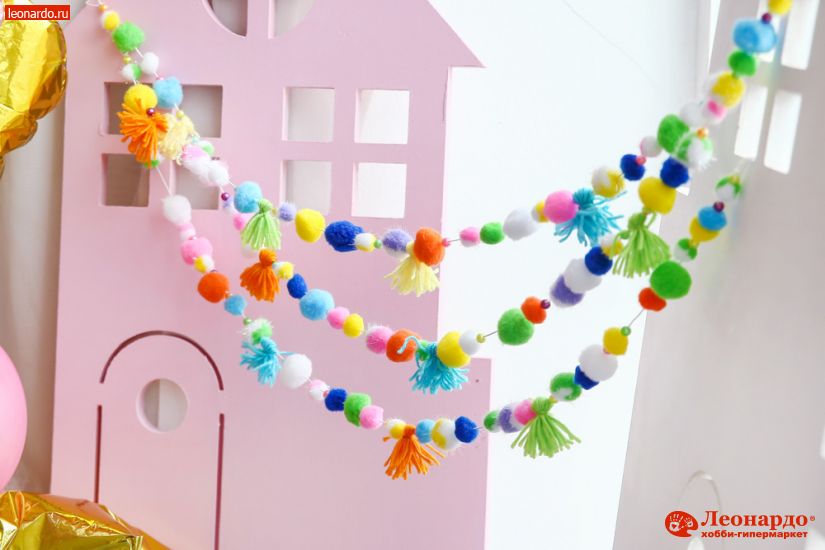 Гирлянды — это простое и доступное творчество. Создавать такие украшения вы можете вместе с ребенком практически из любых материалов! Наша гирлянда интересна разными по фактуре и размеру элементами. Блестящие гладкие бусины, пушистые помпоны и кисточки, которые вы тоже сделаете сами – все они помогают фантазировать и развивают мелкую моторику.